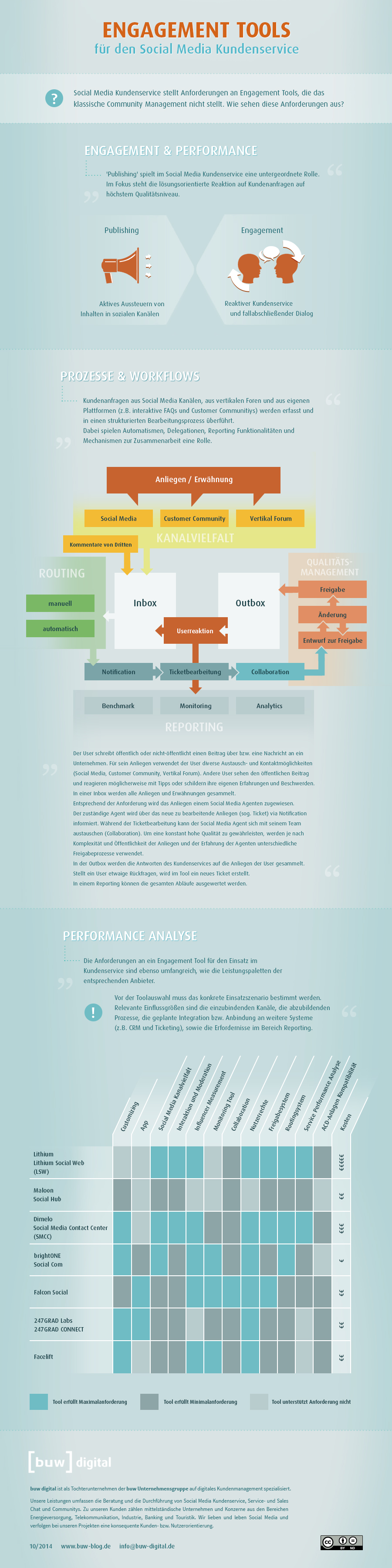 Nachdem lange Social Media Monitoring und Social Media Analytics bei Unternehmen im Vordergrund standen, bekommt in den letzten Jahren immer häufiger das Thema „Engagement“ die höchste Priorität. Vor kurzem hat buw digital 7 Engagement-Tools ausführlich getestet (Lithium, Maloon/SocialHub, dimelo, brightONE, Falcon Social, 247GRAD und Facelift) und die Ergebnisse in einer Infografik verarbeitet, die heute veröffentlicht wurde. Wir freuen uns, dass uns Ben Ellermann hierzu 5 Fragen beantwortet hat.